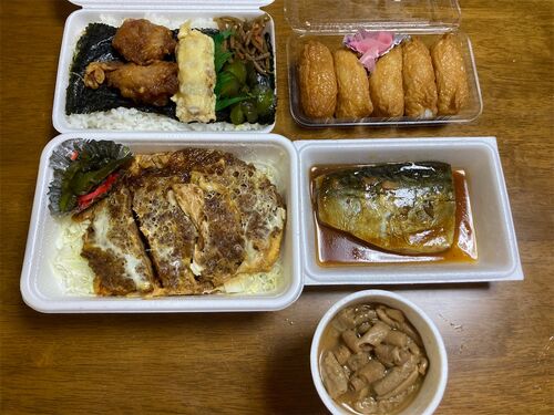 今日は寒いし雪も積もってるので、飯坂から戻った後は引きこもって飲んだくれること決定。 そんな本日のお昼ご飯はコチラ。 飯坂の「お弁当 くりむら」さんで買ってきたお弁当お惣菜各種。 私は鯖味噌、もつ煮込み、お稲荷さんと飲む気満々のラインナップ。 …